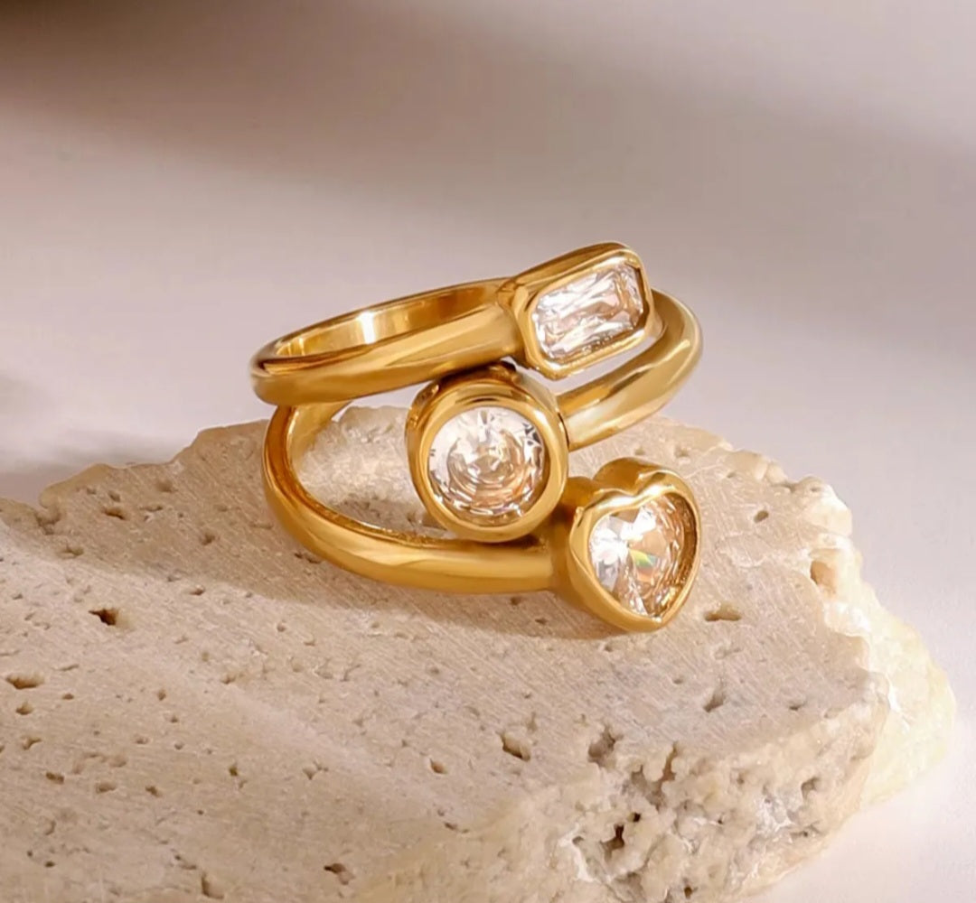 Elegant zircon ring featuring a stunning combination of heart, round, and square-cut stones in one captivating design. Each facet sparkles with brilliant clarity, creating a mesmerizing play of light. The mixed-cut arrangement offers a modern twist on classic elegance, perfect for those who appreciate unique statement pieces. Crafted to catch the eye and complement any occasion, from everyday wear to special celebrations. A versatile addition to your jewelry collection that blends sophistication with contemporary style.